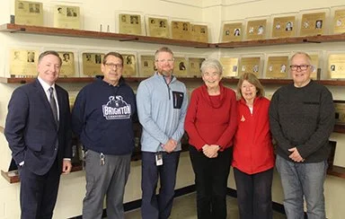 The BSAA recently reinstalled the BSAA/BHS Alumni Hall of Fame member plaques on a new set of display shelves at the Brighton Central School District (BCSD) in 12 Corners, thanks to Brian Knebel, BHS Technology Dept. woodworker who made the shelving; Steve Fox, shelving installer; and several BSAA board members. Many thanks to all who pitched in and supported this project, including the Brighton Central School District. A January 2 dedication gathering featured a commemorative cake!